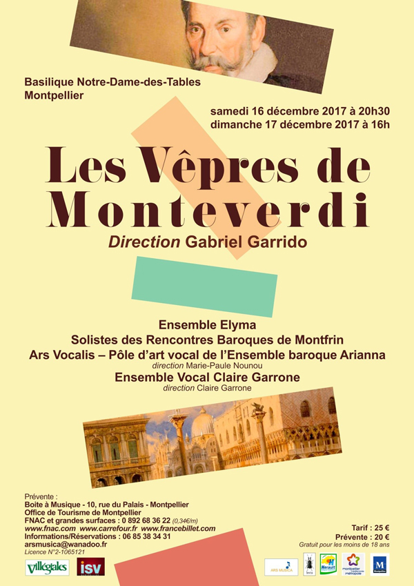 Nous lui avons consacrés nos Concerts de la Semaine Sainte de l’année passée avec des extraits de la Selva morale e spirituale (1640) et du célèbre Vespro della Beata Vergine (1610). Son œuvre sacrée est tellement importante qu’elle mérite que nous fassions de même cette année. Dirigé par Gabriel Garrido, ce projet rassemble les solistes et instrumentistes des Rencontres baroques et Ars Vocalis - pôle d’art vocal de l’ensemble baroque Arianna de Marie-Paule Nounou (Montpellier). Nous avons voulu que les trois concerts donnent un aperçu aussi large que possible de la musique sacrée et du génie du compositeur de Crémone, qui maîtrise aussi bien le le contrepoint de la Renaissance que le nouveau style des affects du Baroque naissant, duquel il est le maître incontesté.
