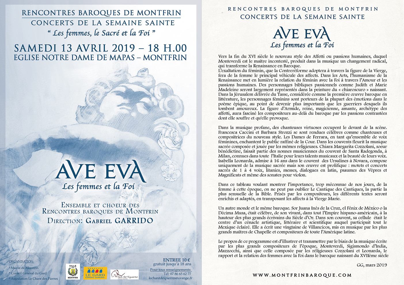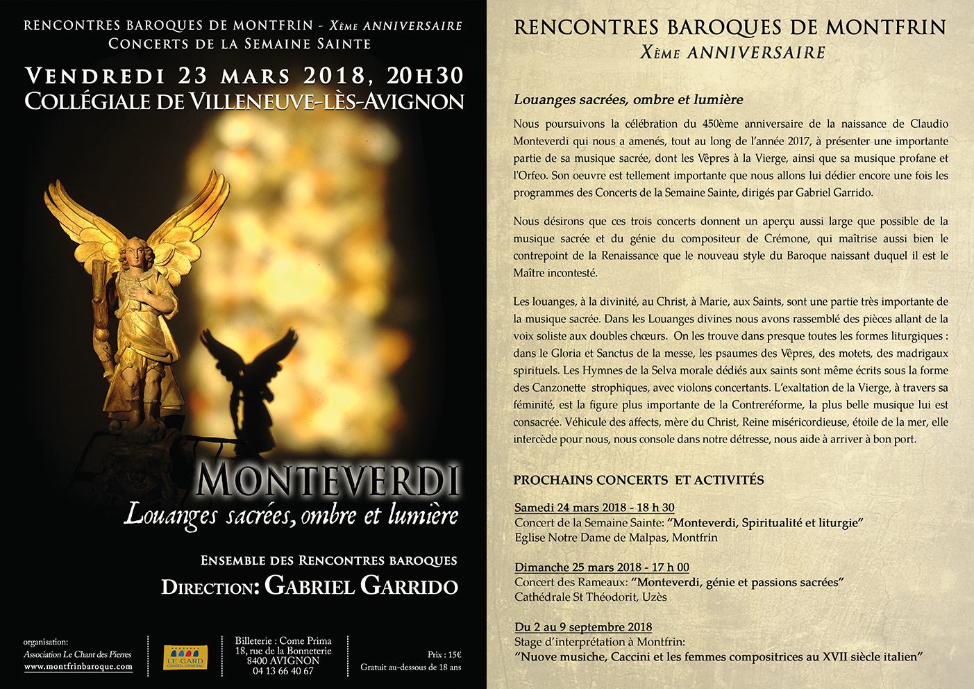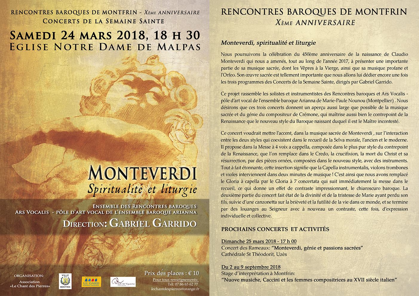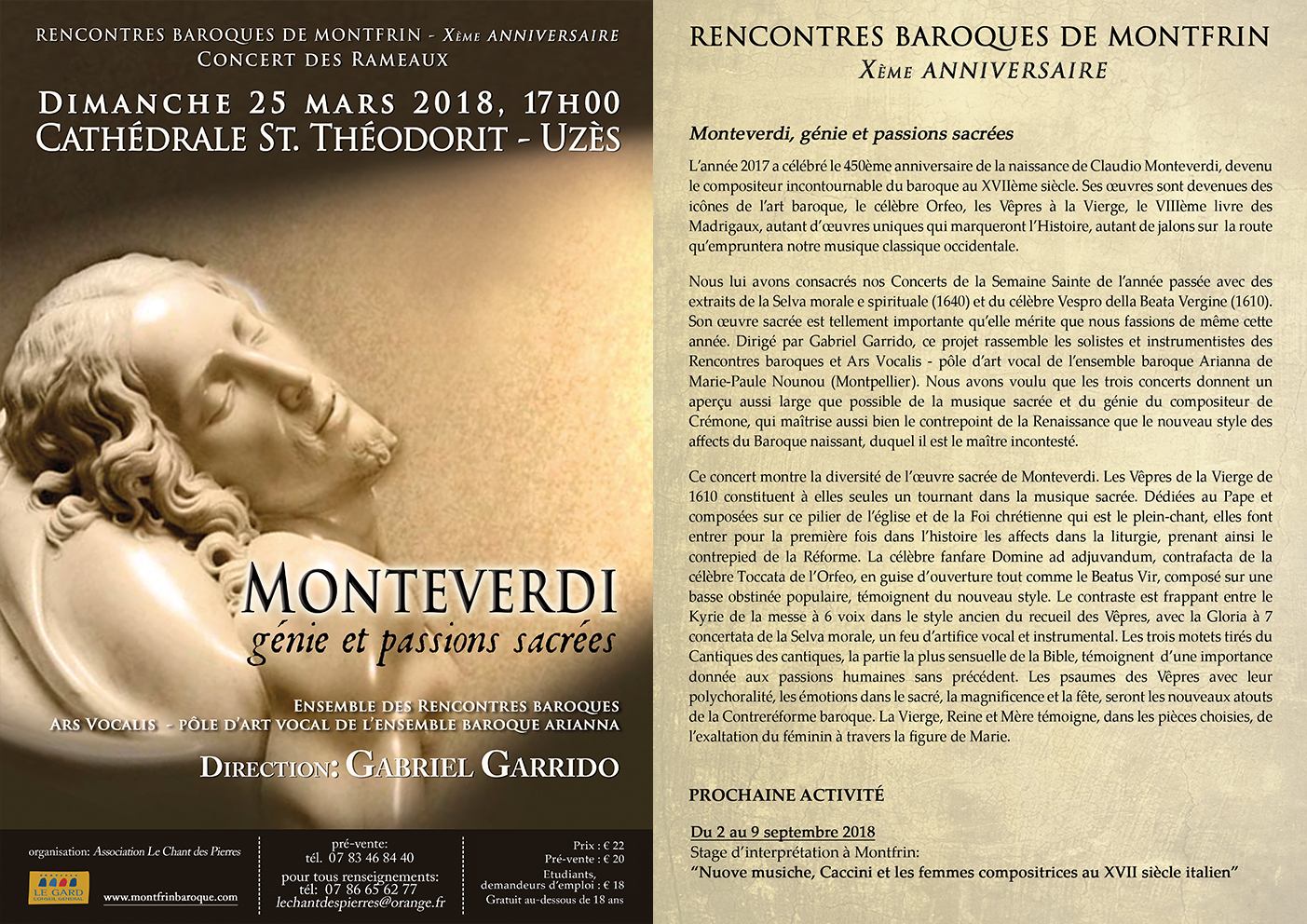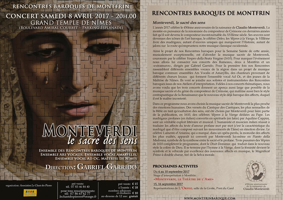 Le but de nos Rencontres baroques pour l’année 2017 est de consacrer toutes lesactivités musicales au génie et à l’œuvre de Monteverdi. Dans le cadre de nosconcerts de la Semaine Sainte, les Vêpres à la Vierge et la Selva morale ont été àl’honneur, partie de l’année dédiée à sa musique sacrée.
