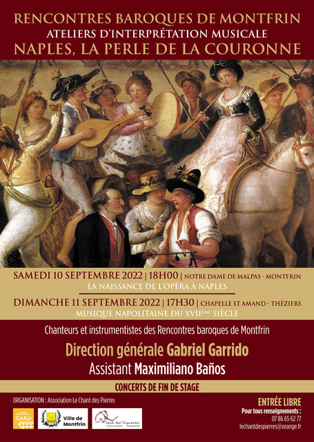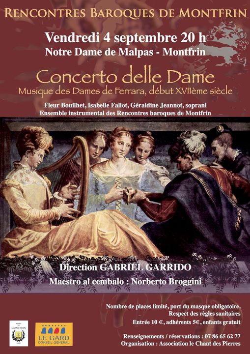 Le premier week-end de septembre on proposera, le vendredi 4 septembre à 20 h.00, un concert à Montfrin à l’église de Notre Dame de Malpas, avec un programme inédit autour des trois cantatrices de la Cour de Ferrare, célèbres dans toute l’Italie du début du XVIIème. Comme solistes nous aurons les sopranos Fleur Bouilhet, Isabelle Fallot et Géraldine Jeannot, habituées de nos ateliers, accompagnées par un ensemble instrumental des Rencontres baroques.