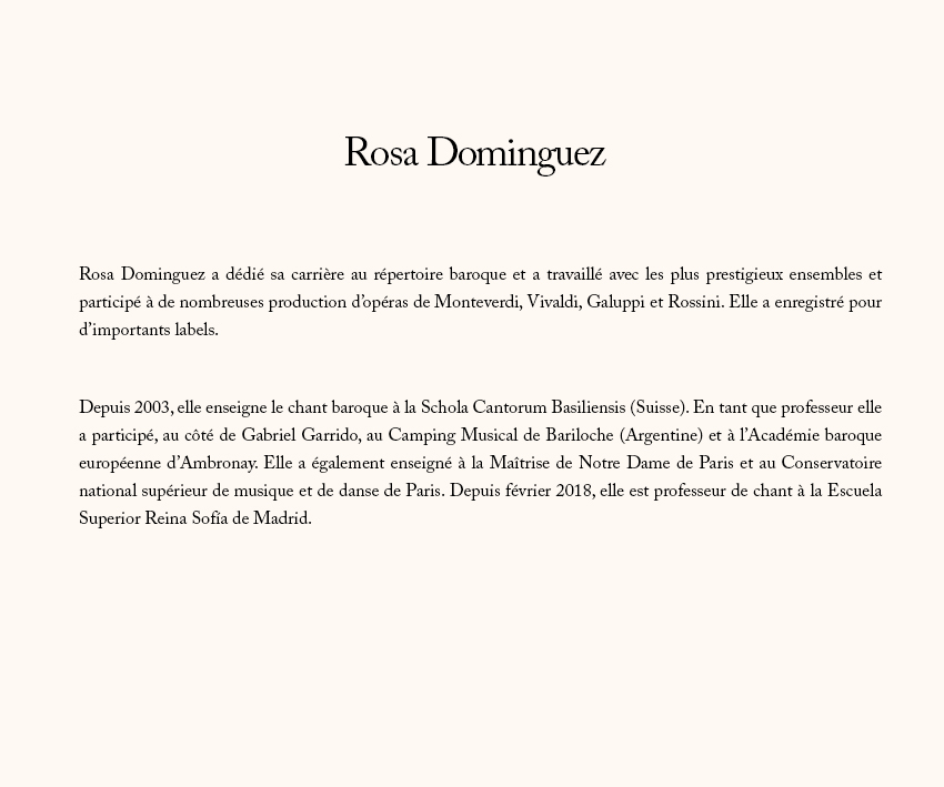 Ce stage s'adresse aux chanteurs professionnels et aux étudiants de haut niveau, qui pourront prendre des cours individuels avec les deux professeurs de chant. Les élèves de basse continue pourront également travailler avec les deux professeurs. Le cours est ouvert à un nombre limité de chanteurs amateurs qui pourront assister à tous les cours et participer à la musique d'ensemble.